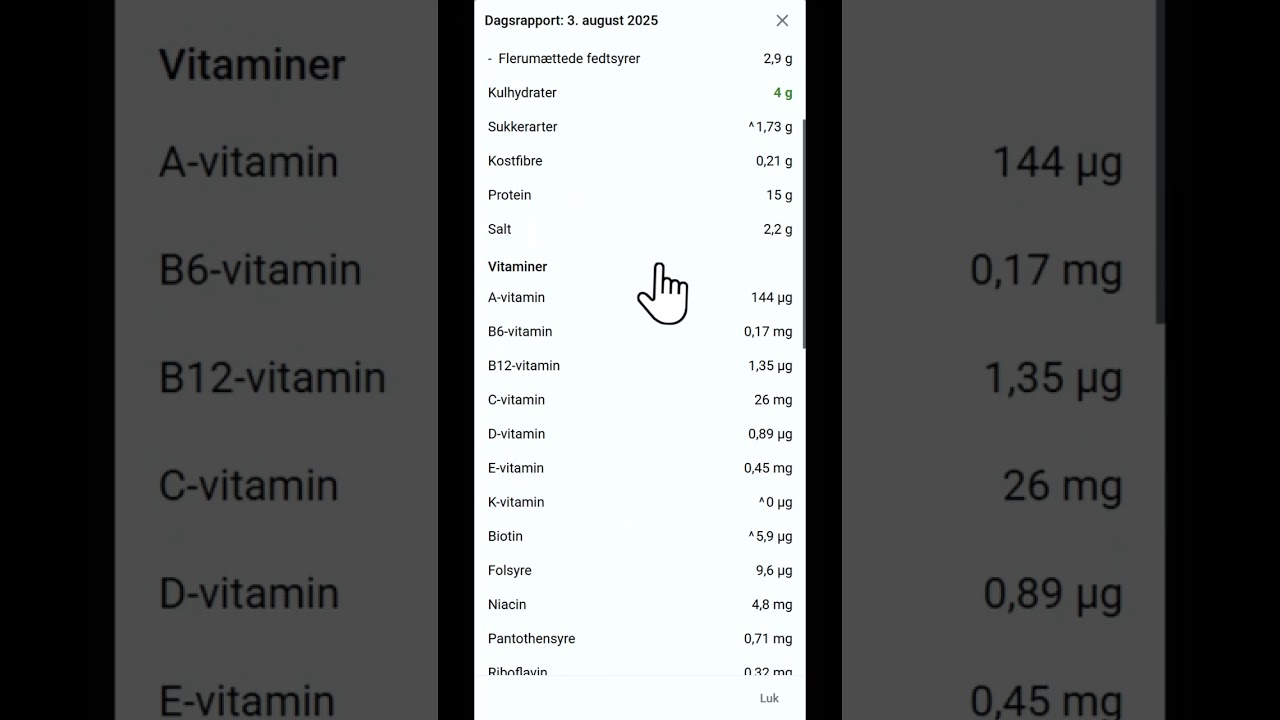 I bunden af din madlog finder du knappen Dagsrapport. Her får du et samlet overblik over alle dagens næringsstoffer, og du kan klikke på hver enkelt for at se detaljer.