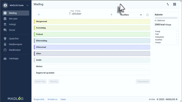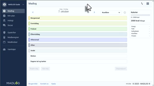 - Madklodser – Hurtig løsning til faste favoritmåltider (fx morgenmad). Ingredienser logges individuelt og kan justeres efter logning.